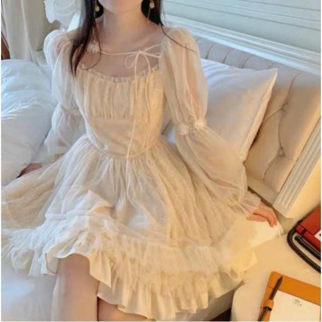 ドレス 結婚式 披露宴 二次会 フォーマル イブニングドレス ミディ丈 ロリータ フリル かわいい レトロ パーティドレス Aライン パフスリーブ