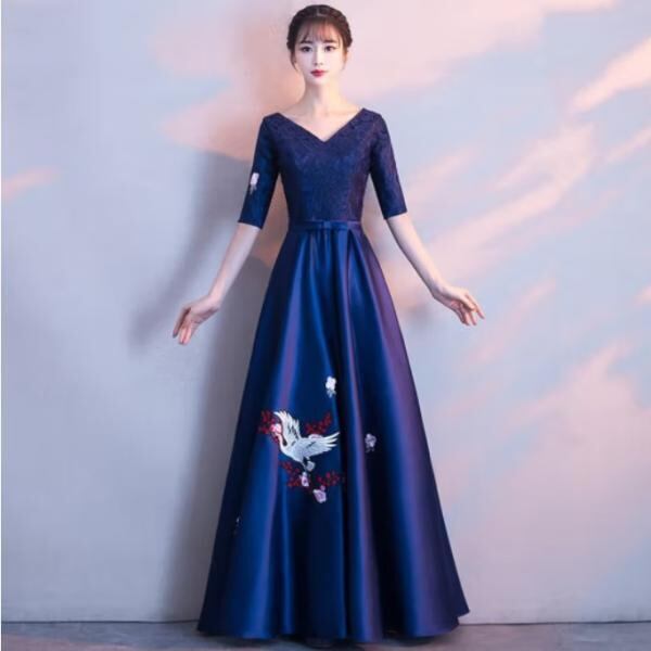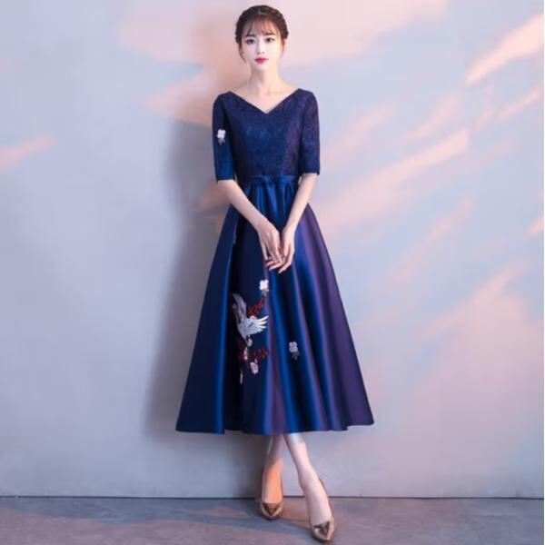 ドレス 結婚式 披露宴 二次会 フォーマル イブニングドレス ロング丈 ミディ丈 華やか エレガント パーティドレス 刺繍 五分袖 七分袖 Aライン