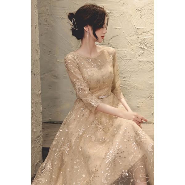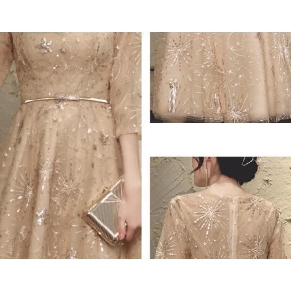 ドレス 結婚式 披露宴 二次会 フォーマル イブニングドレス ロング丈 ミディ丈 華やか エレガント パーティドレス 刺繍 五分袖 七分袖 Aライン