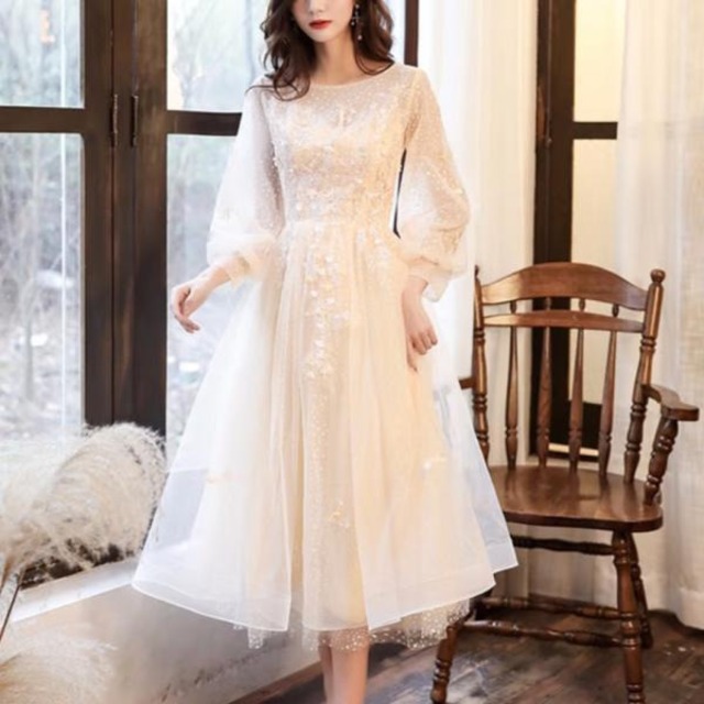 ドレス XS-3XL レディース フォーマル パーティー ワンピース 二次会 Aライン 春夏秋冬 長袖 エレガント オールシーズン 上品 シャンパン