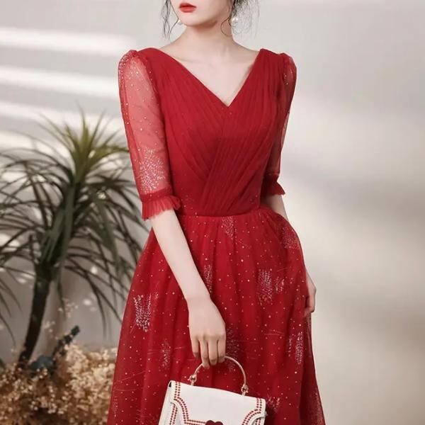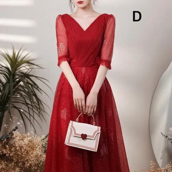 ドレス パーティードレス ロング丈 五分袖 蝶々 Vネック 大人可愛い フォーマル 結婚式 二次会 お呼ばれ hin-1010