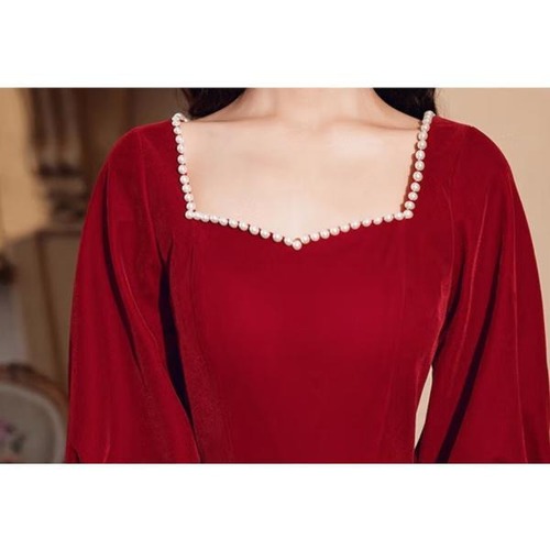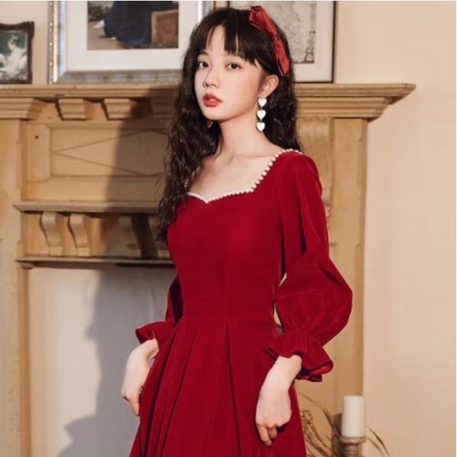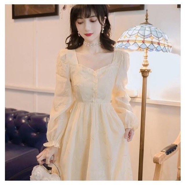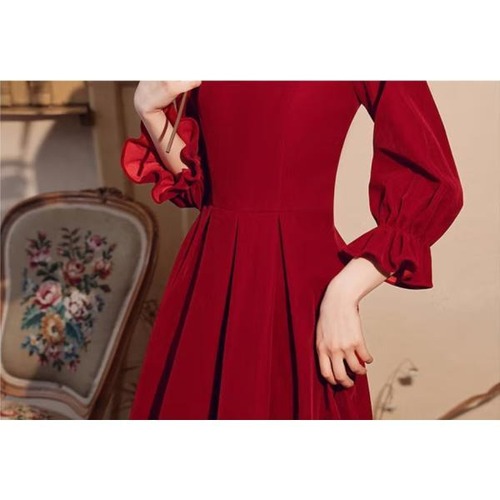 ドレス 結婚式 披露宴 二次会 フォーマル イブニングドレス ロング レトロ エレガント パーティドレス Aライン パフスリーブ 長袖 ハートネック