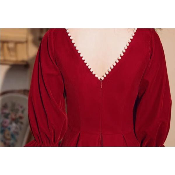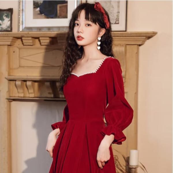 パーティードレス レディース 結婚式ドレス 演奏会ドレス ワンピースドレス ロングドレス ロングワンピース スクエアネック パフスリーブ レース ハード柄 キュート 可愛い ハイウエスト きれいめ