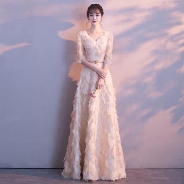 ドレス パーティードレス ロング丈 五分袖 蝶々 Vネック 大人可愛い フォーマル 結婚式 二次会 お呼ばれ hin-1010