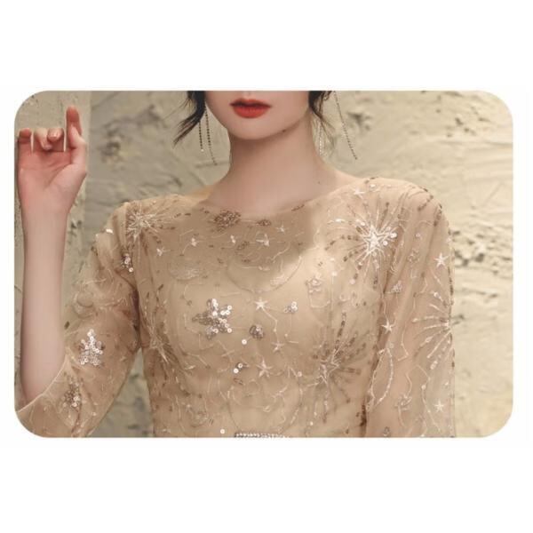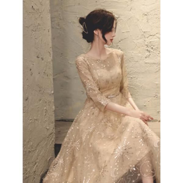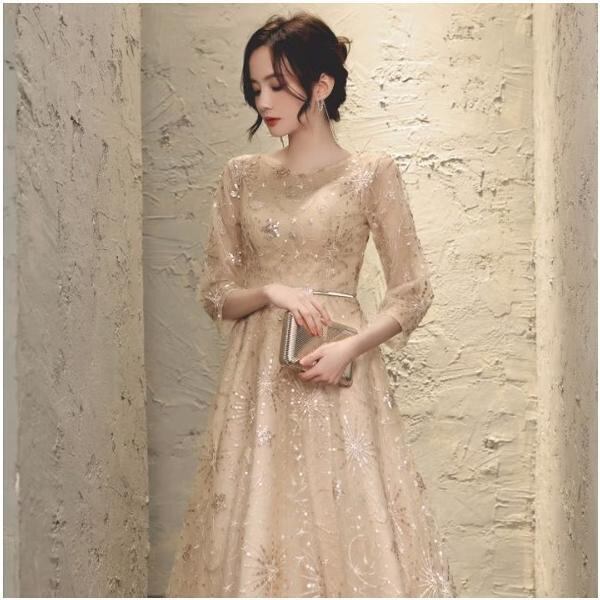 ドレス 結婚式 披露宴 二次会 フォーマル イブニングドレス ロング丈 ミディ丈 華やか エレガント パーティドレス 刺繍 五分袖 七分袖 Aライン