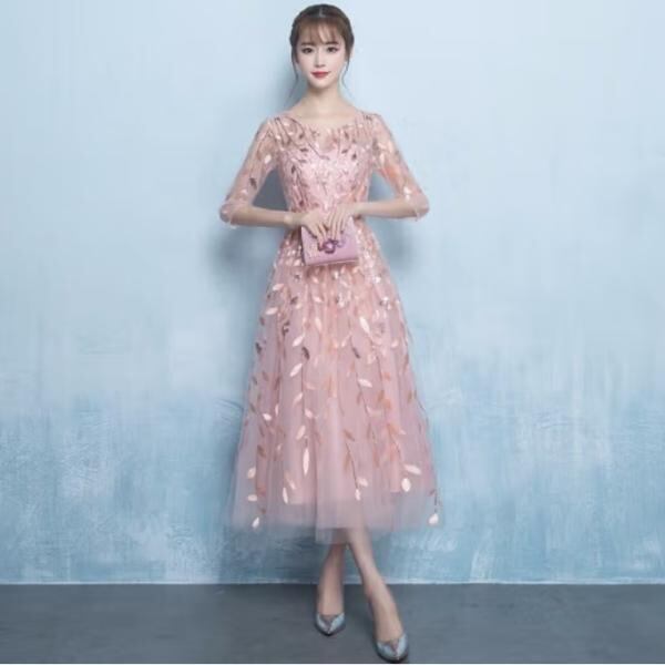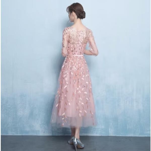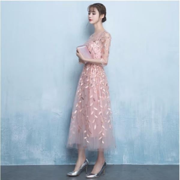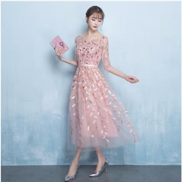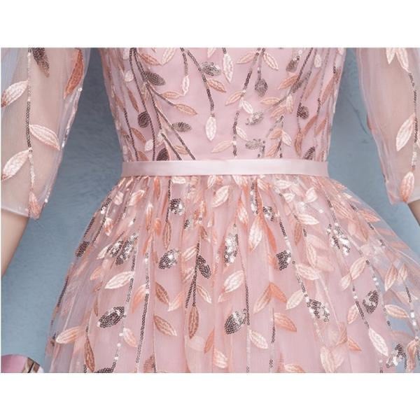 ドレス 膝丈 イブニングドレス ミドル丈 大きいサイズ レース ワンピース 花柄 透け感 ウエストマーク 可愛い 5分丈 きれいめ パーティー 二次会 結婚式 お呼ばれ お食事会 韓国風