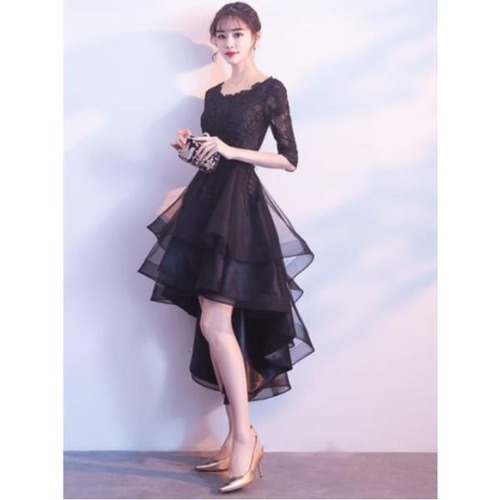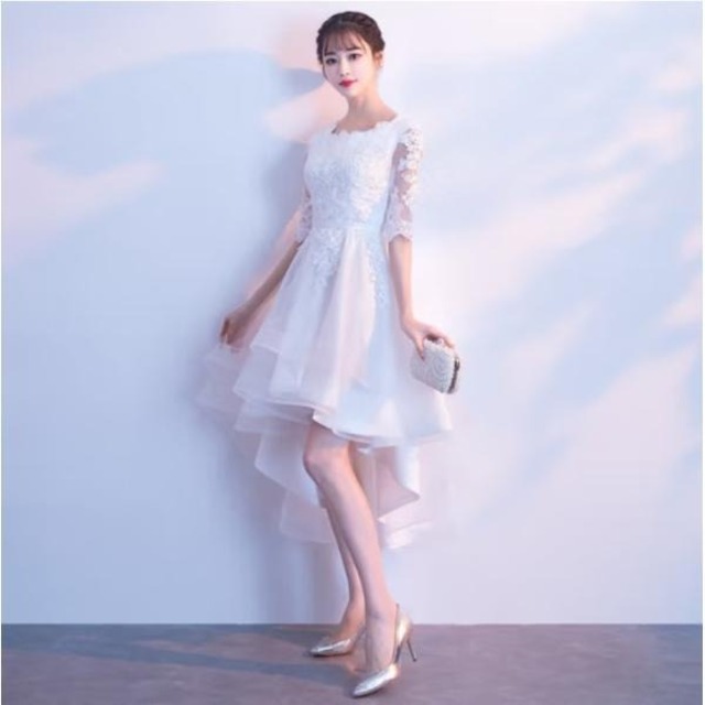 ドレス 結婚式 披露宴 二次会 フォーマル イブニングドレス フロントショート 華やか エレガント パーティ Aライン レース 五分袖 10 20代