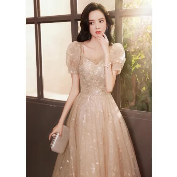 パーティードレス レディース 結婚式ドレス 演奏会ドレス ワンピースドレス ロングドレス ロングワンピース スクエアネック パフスリーブ レース ハード柄 キュート 可愛い ハイウエスト きれいめ