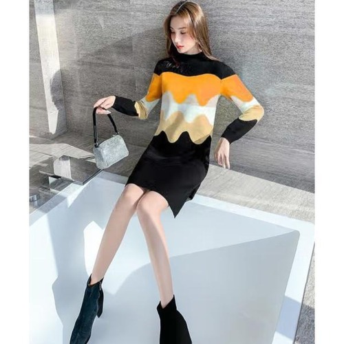 ワンピース ニットドレス レディース ガールズ カジュアル 新作 長袖 プリーツ ベルベット エレガント 通勤 ミディスカート ハーフタートルネック