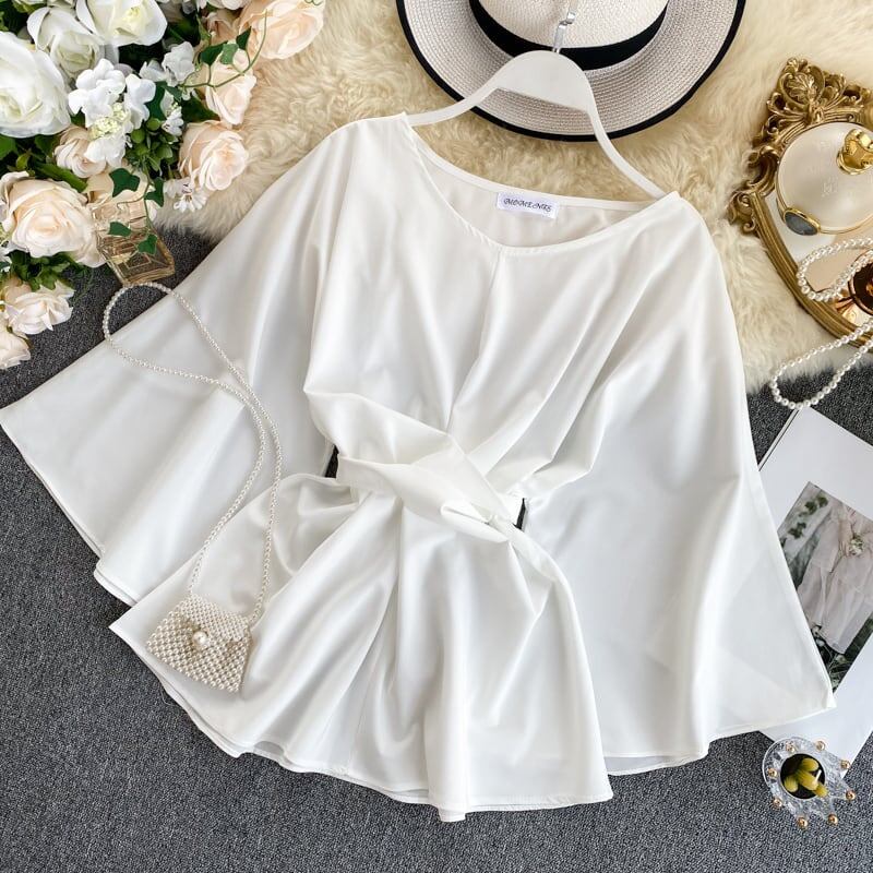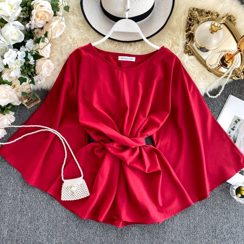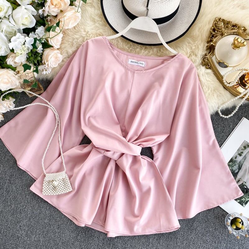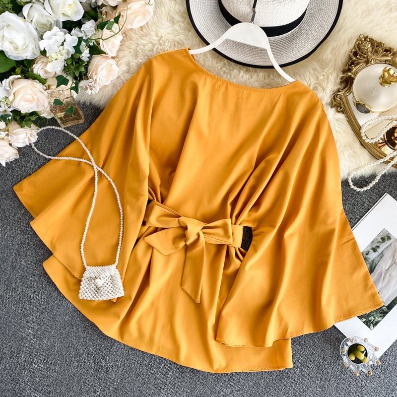 トップス カットソー 長袖 トランペットスリーブ 無地 バックリボン 大人可愛い きれいめ こなれ感 春秋 お出かけ デート 女子会 ウエストマーク ハイウエスト
