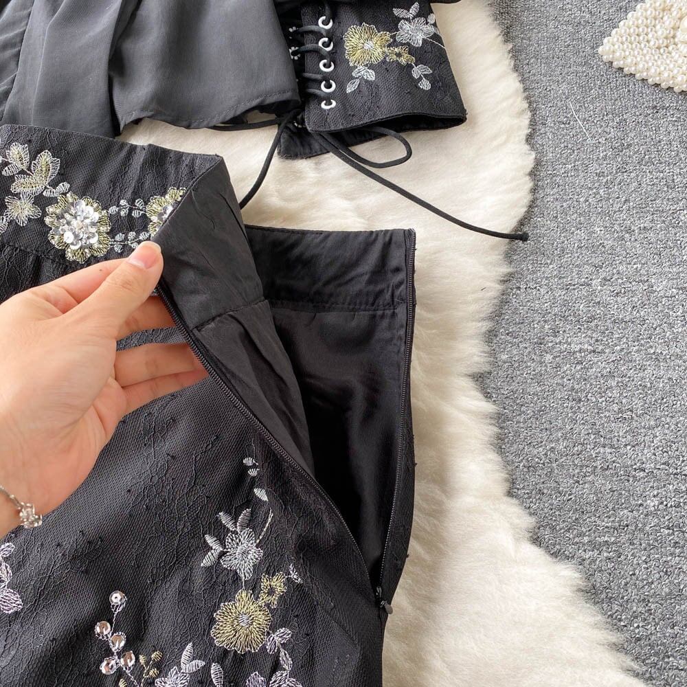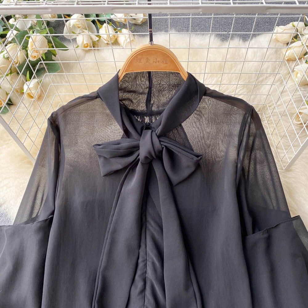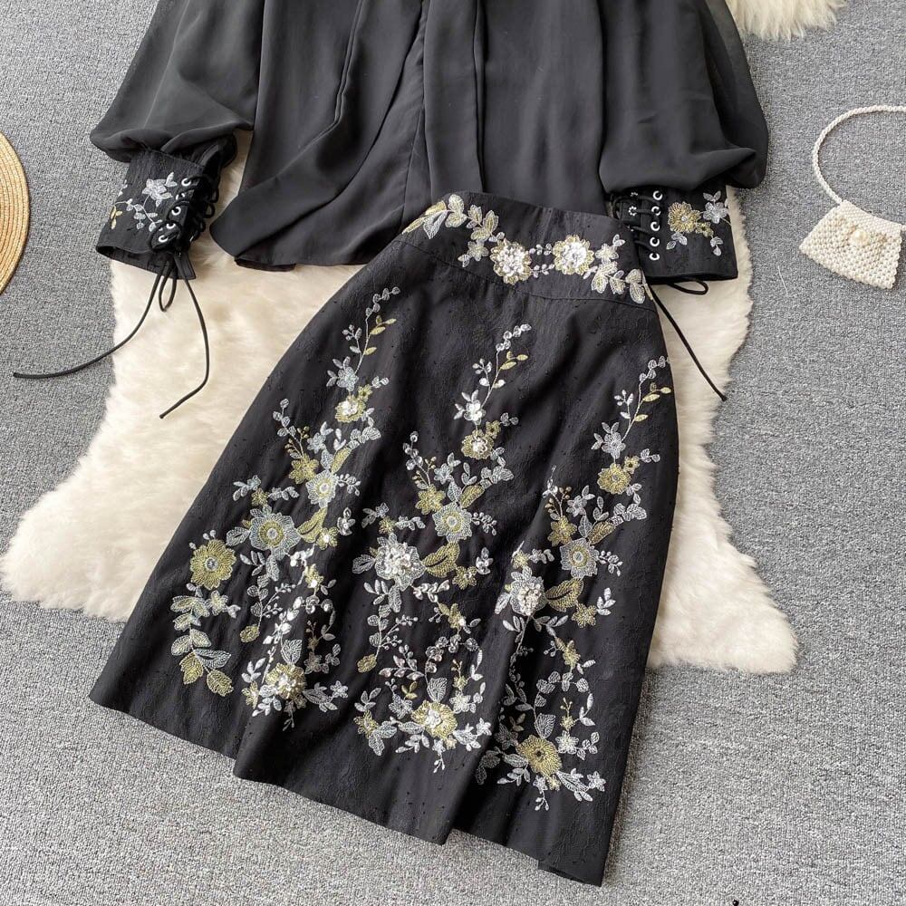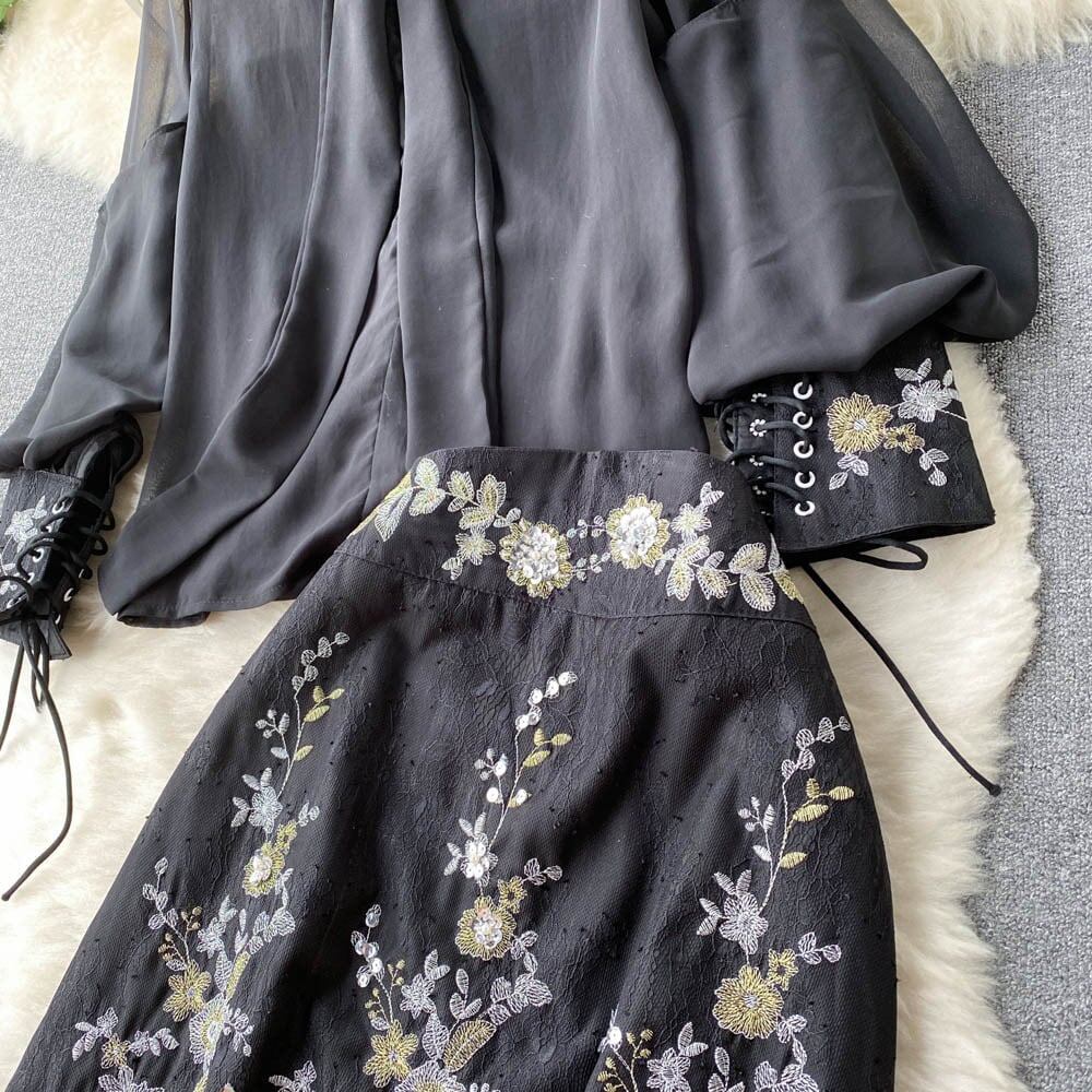 セットアイテム スカート トップス 2ピース レディース ファッション 長袖 韓国 シャンパンカラー Vネック ロングスカート 華奢見え ハイウエスト オシャレ シンプル S M L XL