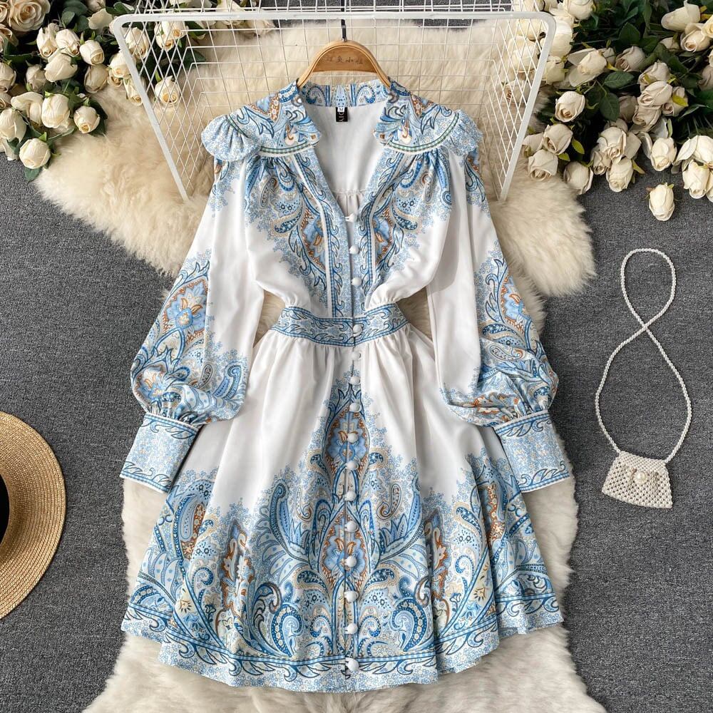 ワンピース ミモレ丈 レディース ファッション お洒落 春 秋 エスニック カジュアル Vネック 体系カバー デザインドレス 個性的 ウエストマーク ハイウエスト お呼ばれ 20代 30代