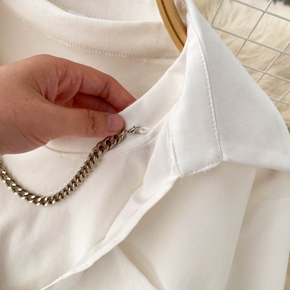 シャツ トップス 長袖 無地 ゆったり アンサンブル風 ショート丈 チェーン 大人可愛い カジュアル きれいめ 春秋 お出かけ デート 女子会 ハイウエスト