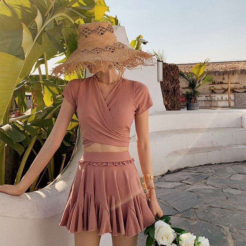 ビキニ レディース 水着 ツーピース スイムウェア ビーチウェア シンプル 無地 カジュアル ハイウエスト 海 ビーチ プール 海水浴 リゾート 体型カバー 2点セット 上下セット スクエアネック