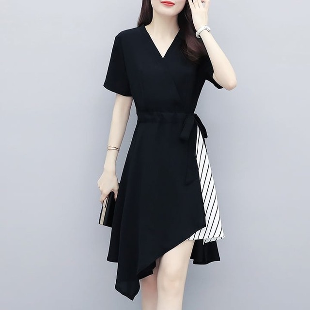 ワンピース ひざ丈 Vネック 半袖 アシンメトリー レディース 大人可愛い フォーマル きれいめ お出かけ 通勤 オフィス お呼ばれ hin-1055