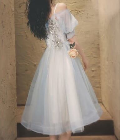 ドレス パーティードレス ひざ丈 5分袖 透け感 刺繍 キラキラ レディース 大人可愛い フォーマル きれいめ 結婚式 二次会 お呼ばれ 謝恩会 hin-1051