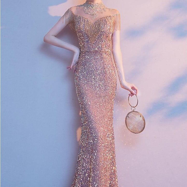 ドレス パーティードレス ロング丈 スパンコール キラキラ 透け感 レディース 大人可愛い フォーマル きれいめ 結婚式 二次会 お呼ばれ 謝恩会 hin-1045