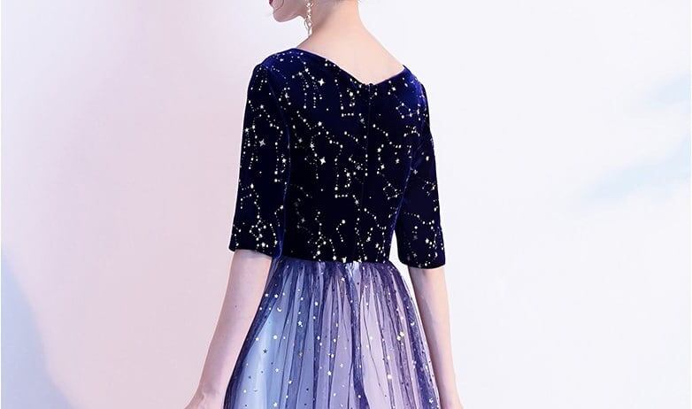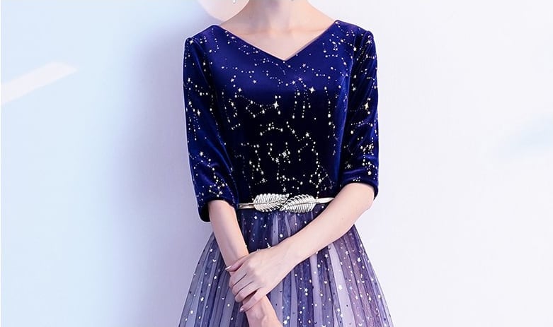 ドレス パーティードレス ロング丈 Vネック 5分袖 キラキラ 透け感 レディース 大人可愛い フォーマル きれいめ 結婚式 二次会 お呼ばれ 謝恩会 hin-1043