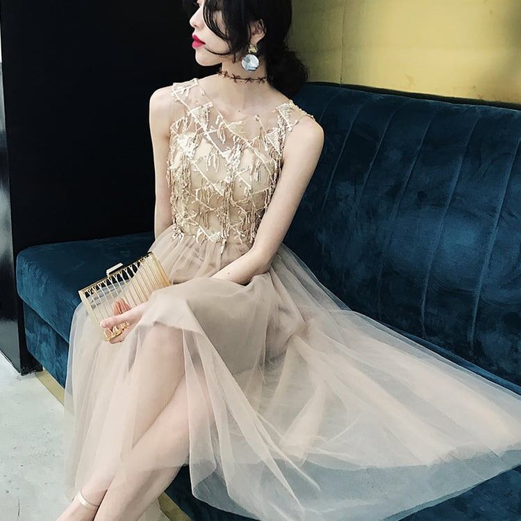 ドレス パーティードレス ひざ丈 ノースリーブ Vネック 透け感 レディース 大人可愛い フォーマル きれいめ 結婚式 二次会 お呼ばれ 謝恩会 hin-1035