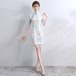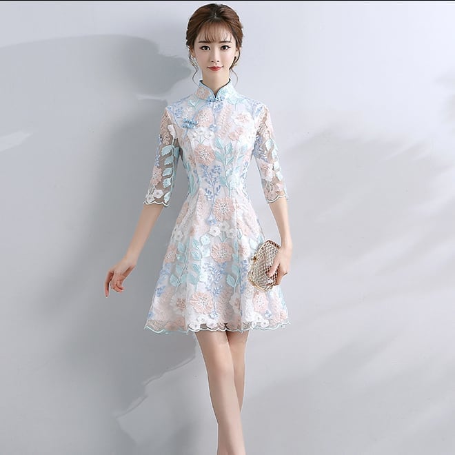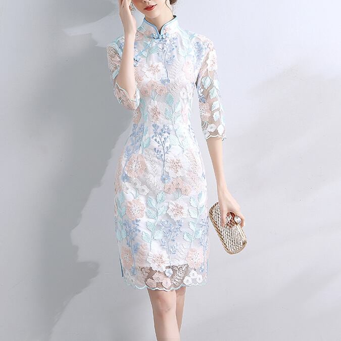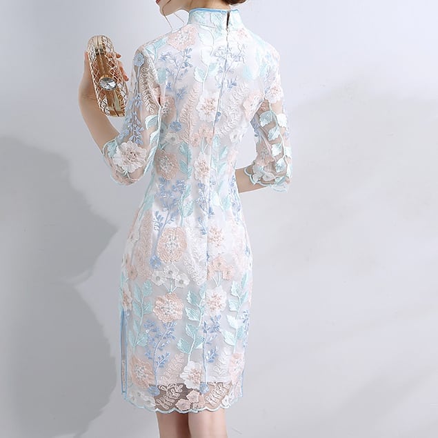 パーティードレス ドレス ひざ丈 チャイナカラー 五分袖 透け感 花刺繍 レディース 大人可愛い フォーマル きれいめ 結婚式 二次会 お呼ばれ 謝恩会 hin-1028