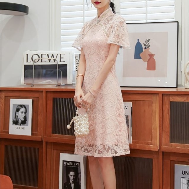 パーティードレス ドレス ひざ丈 チャイナカラー 半袖 透け感 レディース 大人可愛い フォーマル きれいめ 結婚式 二次会 お呼ばれ 謝恩会 hin-1027