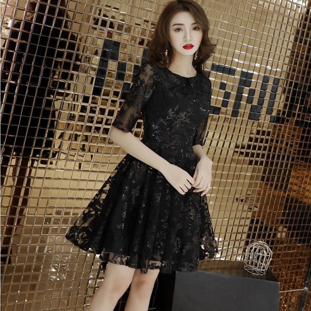 パーティードレス ドレス ミニ丈 5分袖 キラキラ 透け感 レディース 大人可愛い フォーマル きれいめ 結婚式 二次会 お呼ばれ 謝恩会 hin-1025