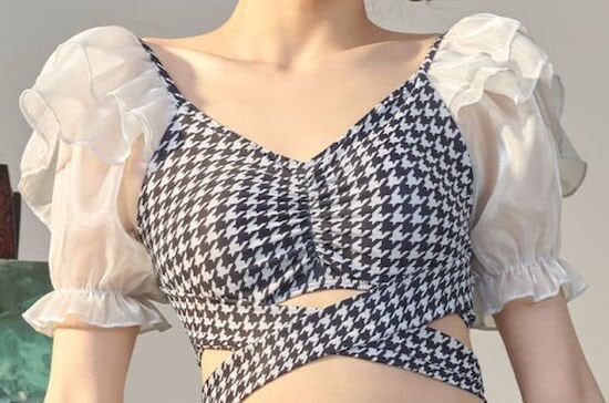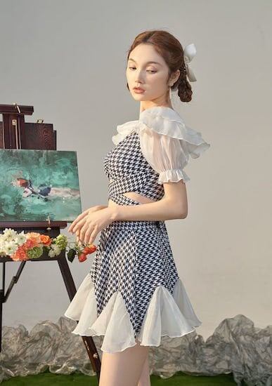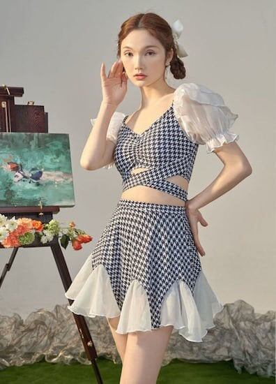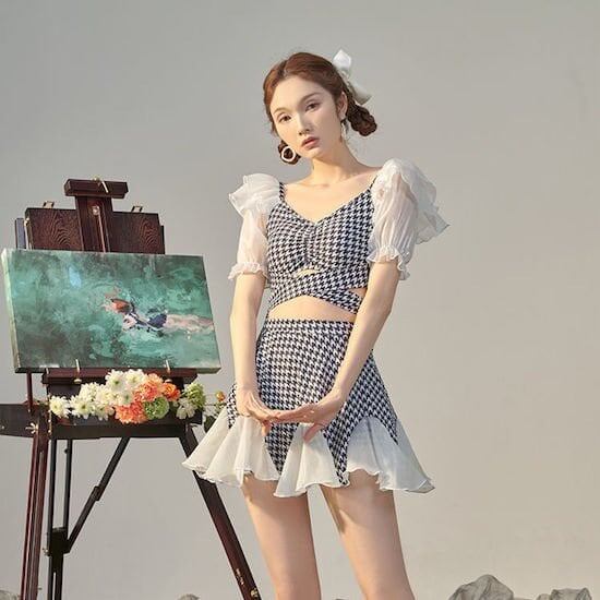 水着 ワンピース水着 レディース 半袖 袖あり スカート 千鳥格子 デート カジュアル 旅行 温泉 プール リゾート 海 レトロ キュート ラブリー ガーリーお洒落 可愛い 10代 20代 ホワイト