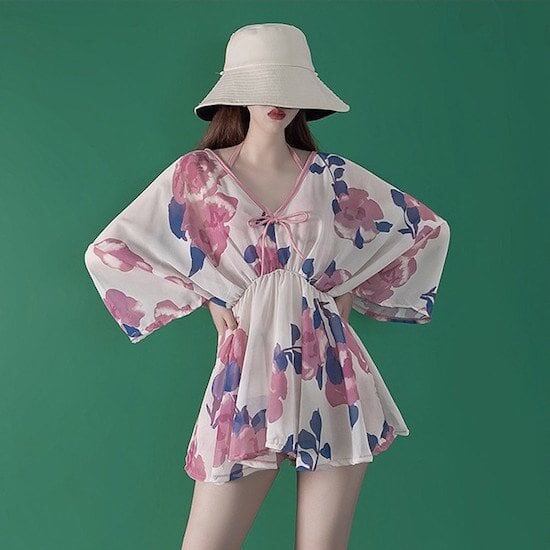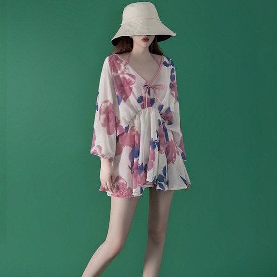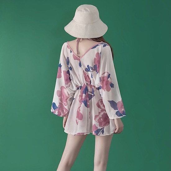 水着 タンキニ水着 レディース カーディガン付き 3点セット 長袖 袖あり カジュアル 花柄 体型カバー 旅行 温泉 プール リゾート 海 レトロ キュート お洒落 可愛い 20代 30代 ピンク
