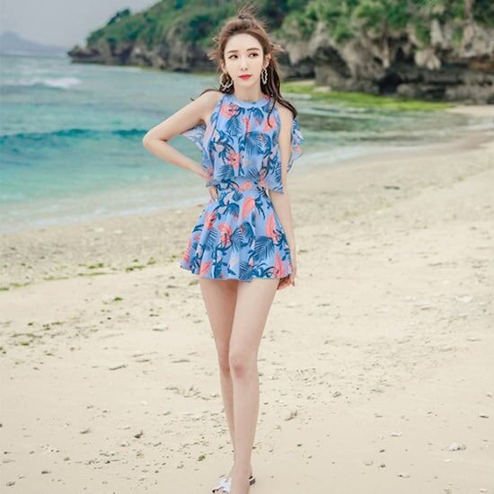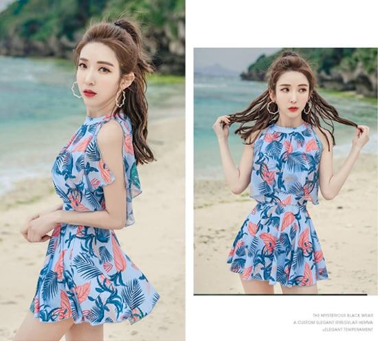 水着 ワンピース レディース ノースリーブ リーフ 体型カバー ハイウエスト リゾート 海 温泉 プール ラブリー キュート ガーリー 女っぽ レトロ 20代 30代 可愛い かわいい お洒落 ブルー