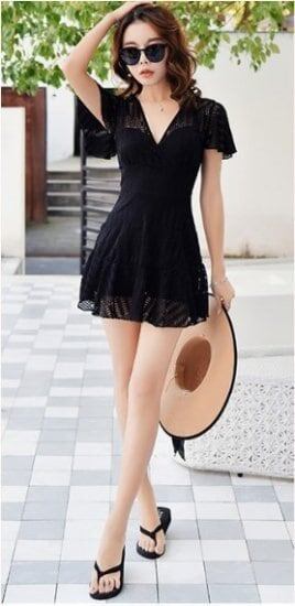水着 透け感 セクシー Vネック レース 無地 ワンピース 半袖 クロスバンド フレア くびれ 大人 可愛い レディース 女性 春 夏 海 リゾート プール 体型カバー 着痩せ 美シルエット 美脚
