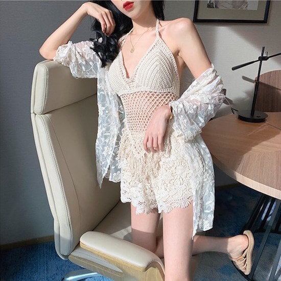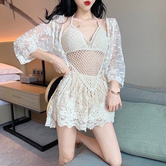 水着 ビキニ ショートパンツ レディース カーディガン 3点セット レース 透け感 キュート ガーリー リゾート プール 温水 温泉 きれいめ 10代 20代 可愛い お洒落 おしゃれ アプリコット