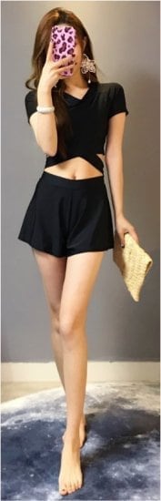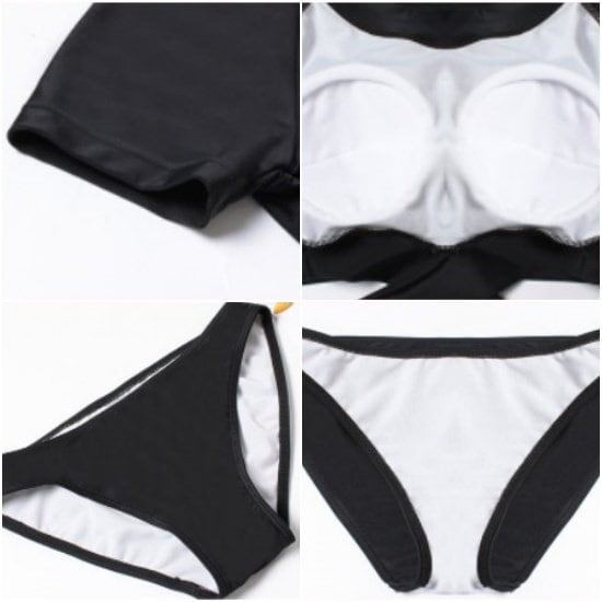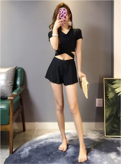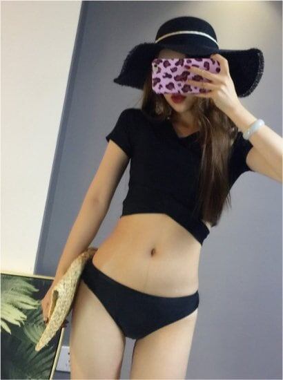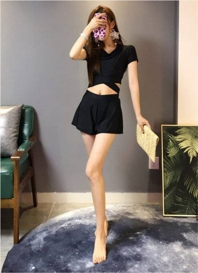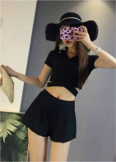 水着 セクシー 2WAY 半袖 Vネック 無地 黒 ブラック ウエスト切り替え くびれ 大人 可愛い レディース 女性 春 夏 海 プール 体型カバー 着痩せ オルチャン 美シルエット 美脚