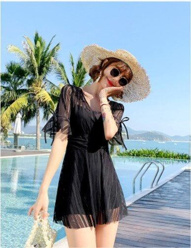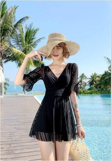 水着 ワンピース水着 パッド付き 半袖 無地 透け カシュクール Vネック ウエスト切り替え 大人 レディース 女性 夏 ビーチ プール スカート 体型カバー 日焼け防止 着痩せ オルチャン 脚長