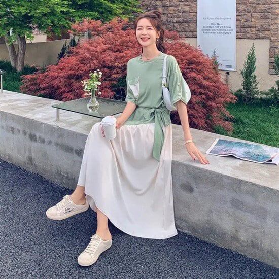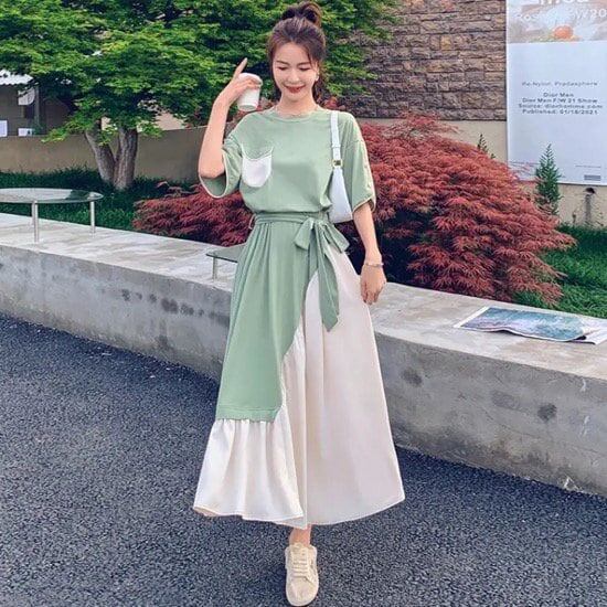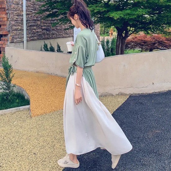 ワンピース バイカラー ドレス レディース ファッション お洒落 アシメ リボン ハイウエスト 足長効果 スタイルアップ ツートン カジュアル きれいめ S M L XL Aライン ミモレ丈