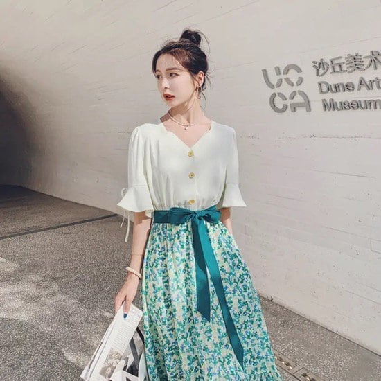 ワンピース ドレス ミモレ丈 切り替え きれいめ 五分丈 五分袖 デート オシャレ 高見え ハイウエスト Aライン デザイン スカート Vネック グリーン 春 夏 秋 S M L