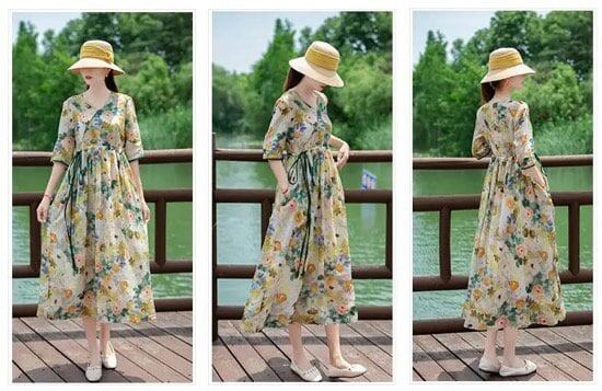 ワンピース 花柄 Vネック 半袖 夏 春 ゆったり ミモレ丈 ハイウエスト レディース ファッション ヴィンテージ レトロ シック お出かけ 旅行 S M L XL 体系カバー デート 華奢見え