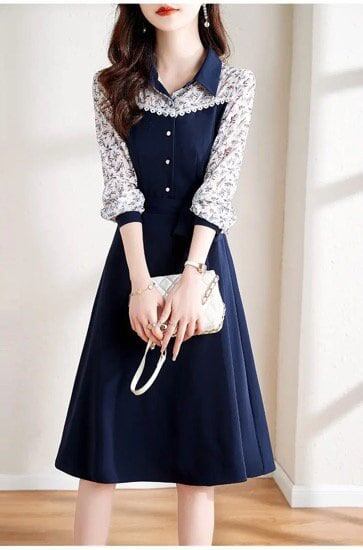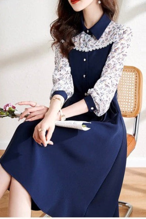 ワンピース 小花柄 春 レディース ファッション 透け感 お洒落 ネイビー ハイウエスト ウエストマーク Aライン 高見え エレガント シック シンプル S M L XL 2XL 秋 冬