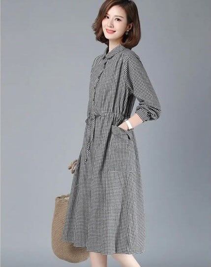 ワンピース レディース ファッション お洒落 春 秋 ミモレ丈 ドレス ギンガムチェック チェック柄 ゆったり カジュアル お出かけ 長袖 コットン ハイウエスト 体系カバー オシャレ M L XL