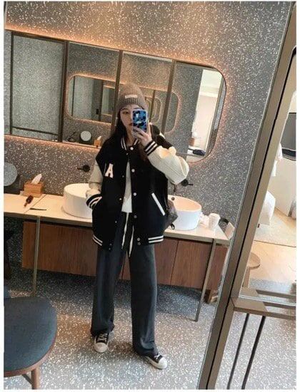 ブルゾン レッド ブラック レディース ファッション 春 秋 野球 学生 ゆったり ビックシルエット オシャレ 制服 ロゴ ノーカラー S M L XL ボタン こなれ感 カジュアル 普段着 部活