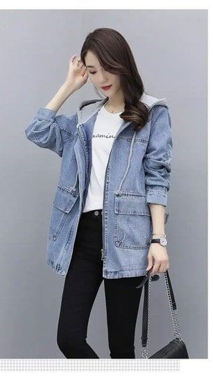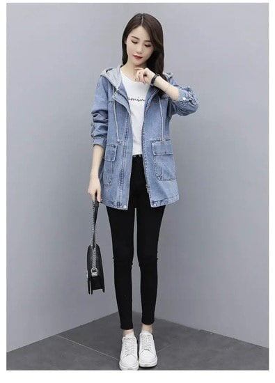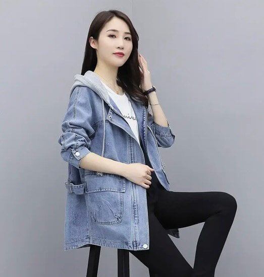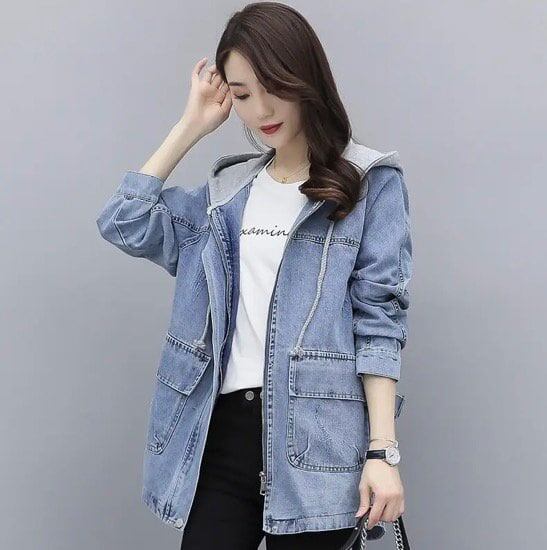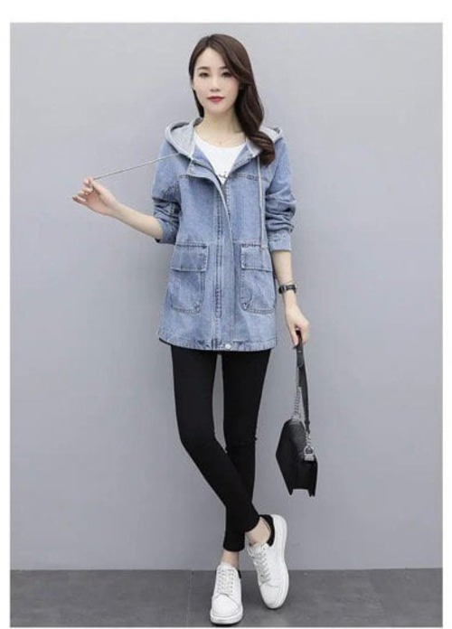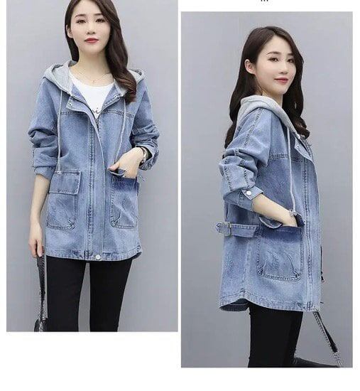 デニムジャケット レディース ファッション お洒落 フード 春 秋 ミドル丈 M L XL カジュアル オシャレ お出かけ 普段着 ブルー ポケット 10代 20代 30代 ゆったり 体系カバー