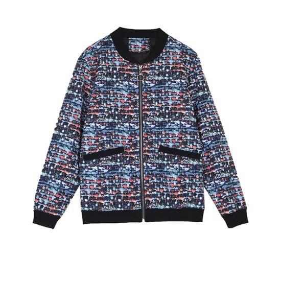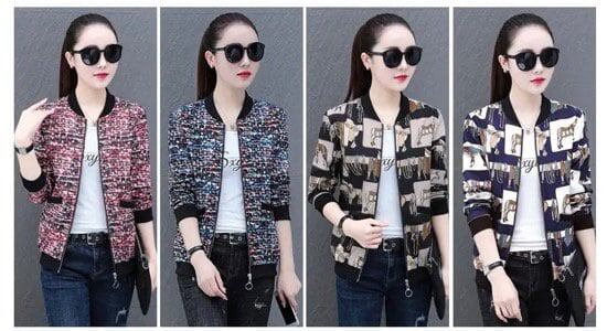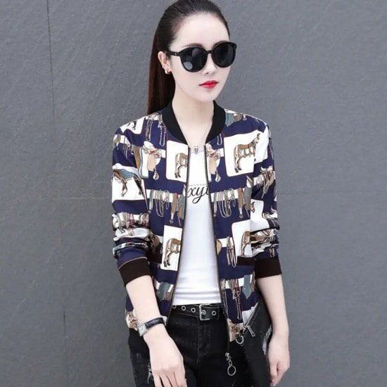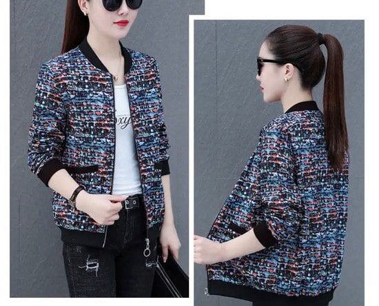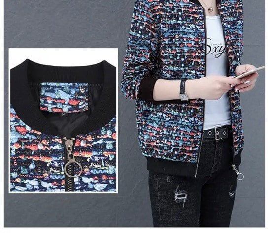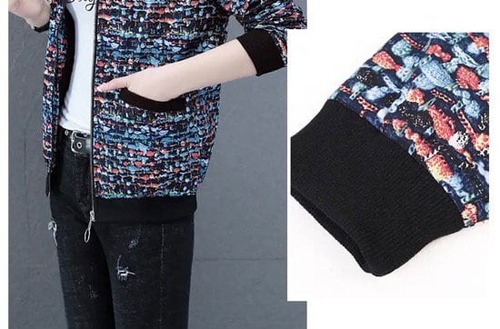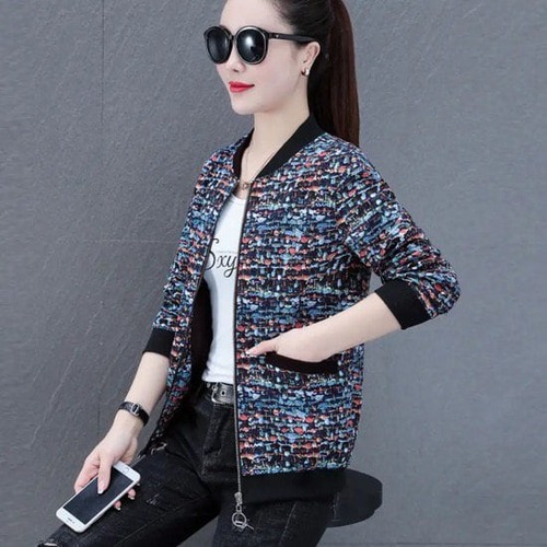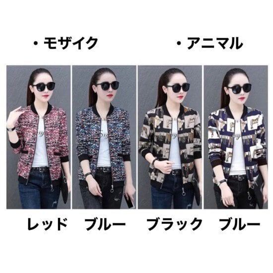 ブルゾン アウター 羽織り カーディガン レディース ファッション レッド ブルー アニマル モザイク ノーカラー チャック ファスナー ファブリック オシャレ きれいめ エレガント 高見え お洒落