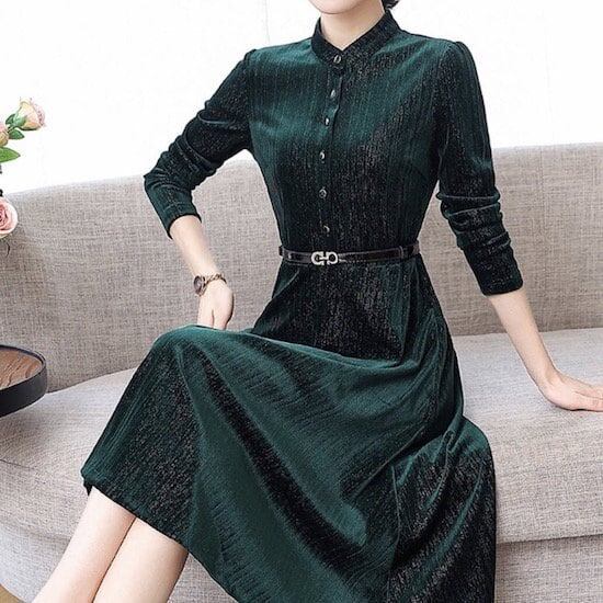ワンピース ひざ丈 ベルベット 長袖 スリム ベルト ボタン Aライン Vネック ハイウエスト プルオーバー 可愛い お洒落 春 秋 レトロ グリーン ブラック ネイビー 20代 30代 レディース