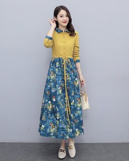 ワンピース ロング丈 花柄 長袖 襟付き ボタン リボン Aライン ハイウエスト 大人可愛い 個性的 きれいめ お洒落 春 秋 レトロ イエロー ネイビー 20代 30代 レディース お呼ばれ