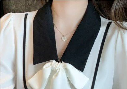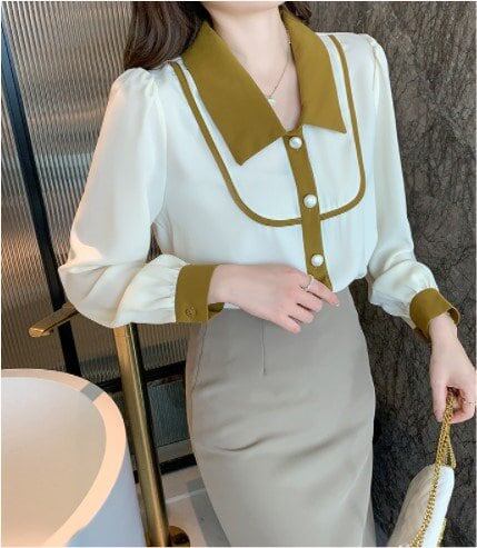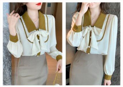 トップス シャツ ブラウス レディース 配色ブラウス シフォン 長袖 パール風ボタン 女性 お出かけ パーティ お食事 シーン 春 夏 大人 リボン フェミニン 薄手 きれい見え 可愛い