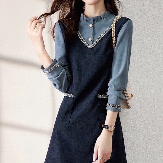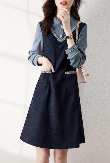 ワンピース ミドル丈 長袖 切り替えデザイン ポケット ボタン プルオーバー Aラインスカート ハイウエスト 春 秋 冬 レトロ ネイビー 10代 20代 レディース お出かけ デート カジュアル