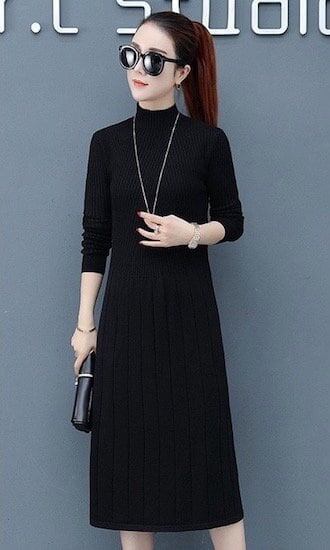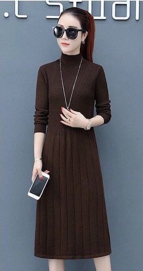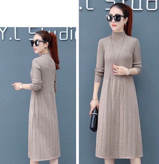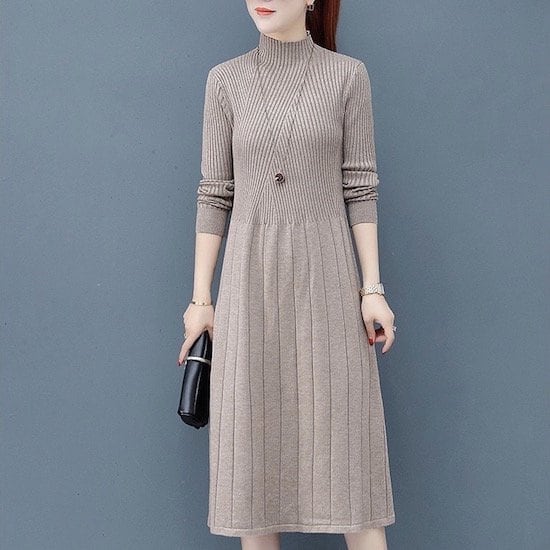 ワンピース ミドル丈 ニット 長袖 無地 シンプル シック スタンドカラー プルオーバー Aラインスカート ハイウエスト 春 秋 冬 レトロ ベージュ ブラック ブラウン 20代 30代 レディース