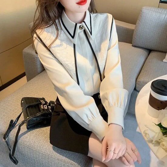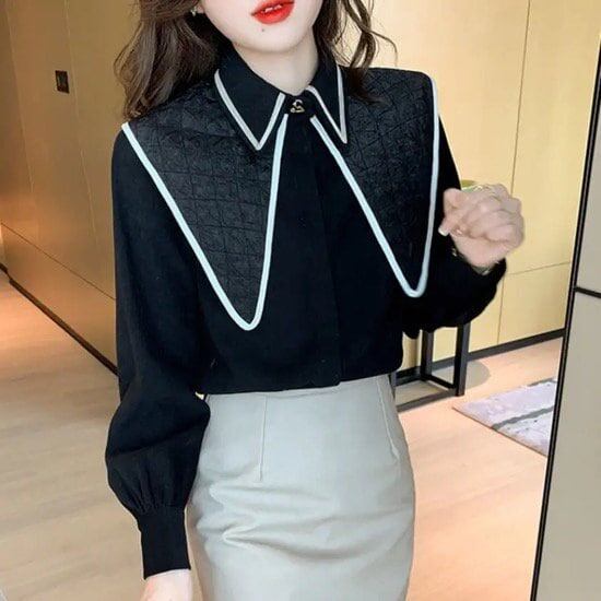ブラウス レディース 長袖 春 アプリコット ブラック ピンク ビック襟 こなれ感 清楚 きれいめ お呼ばれ オフィス 上品 ポロカラー 通勤 ネックボタン 高見え お洒落 S M L XL