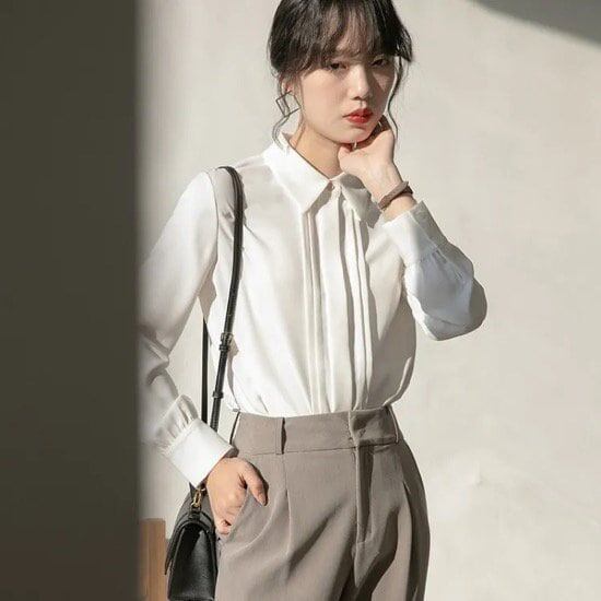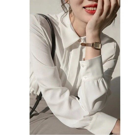 ホワイト ブラウス 長袖 シャツ 通勤 オフィス 仕事 きれいめ 高見え お洒落 オシャレ 春 夏 就活 20代 ポロカラー ボタン 清楚 上品 シック シンプル エレガント S M L XL
