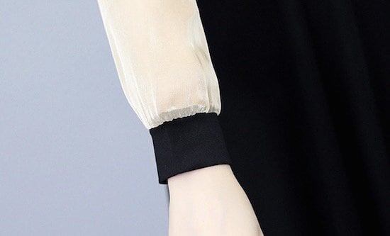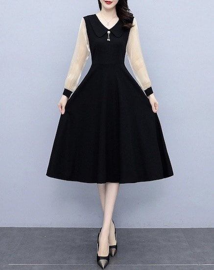 ワンピース ミドル丈 長袖 無地 シンプル 切り替えデザイン シック プルオーバー Aラインスカート ハイウエスト 春 秋 レトロ ブラック ベージュ 20代 30代 レディース お出かけ お呼ばれ