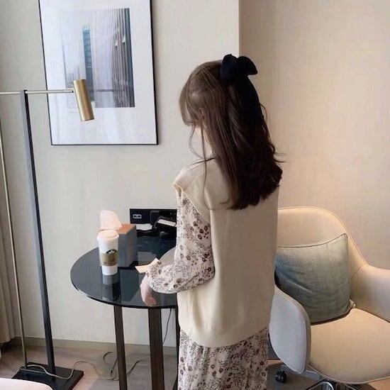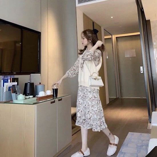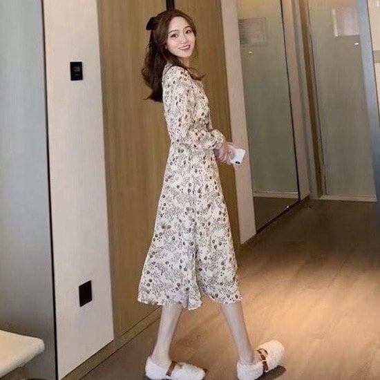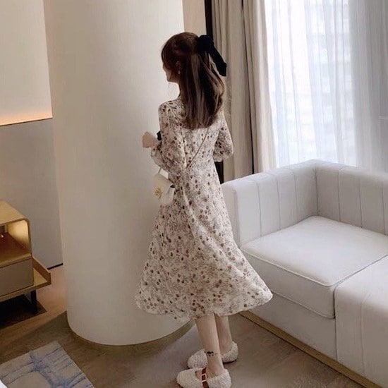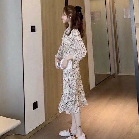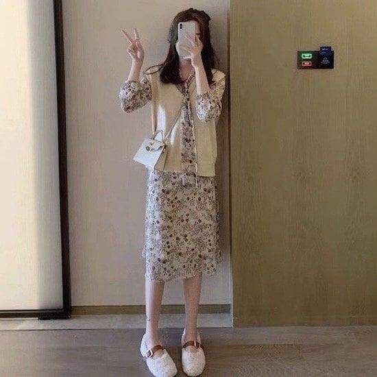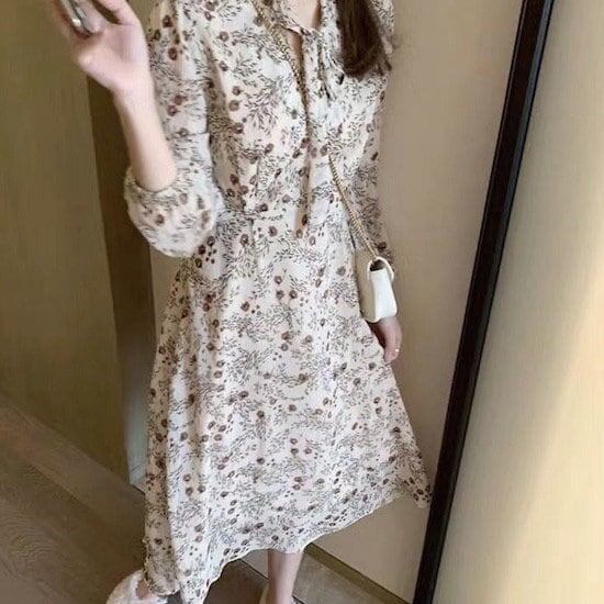 ワンピース ミドル丈 花柄 長袖 ベスト付き 2点セット 襟付き リボン プルオーバー Aライン ハイウエスト 春 秋 レトロ ベージュ 10代 20代 レディース お出かけ お呼ばれ デート
